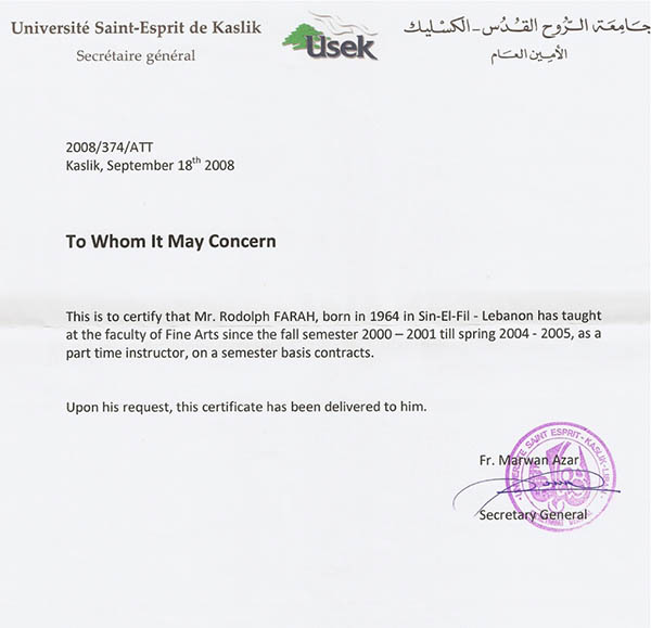 Prof. Rodolph Raymond Farah, a Bircham International University Doctorate graduate, has been teacher at USEK - Univesité Saint-Espirit de Kalisk (Lebanon) for several years.